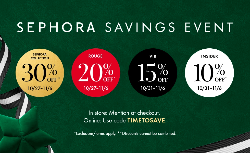 For online shopping, visit sephora.com and use code TIMETOSAVE during checkout.